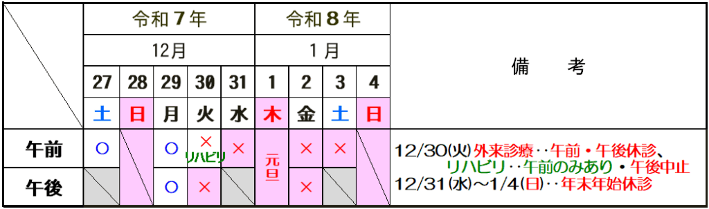 お知らせ令和7年12月30日(火)~ 令和8年1月4日(日)まで、休診とさせていただきます。