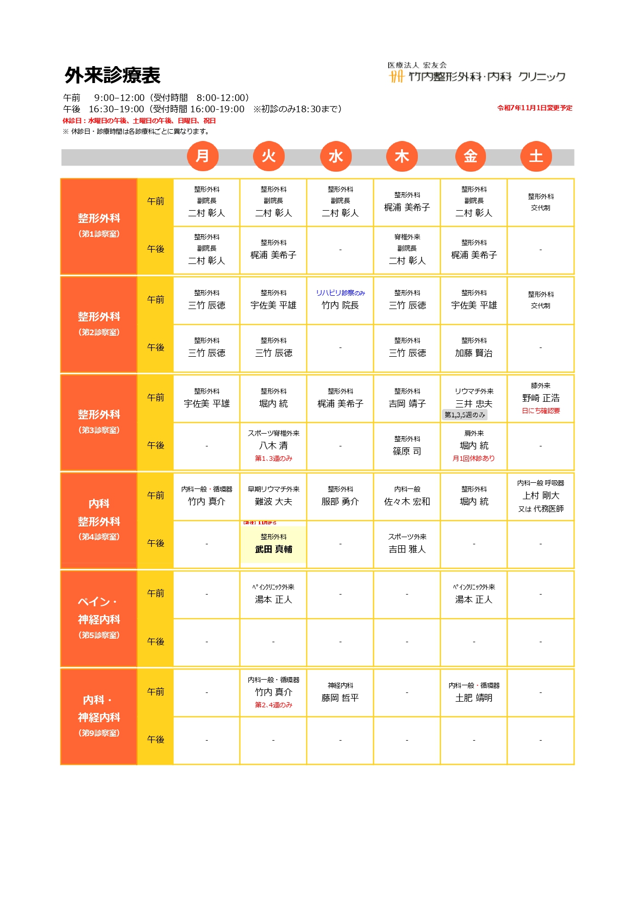 外来医師の担当表